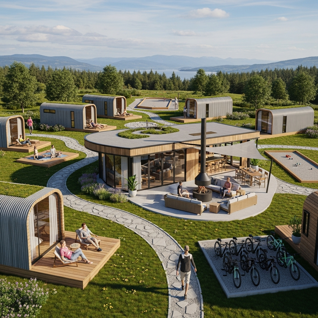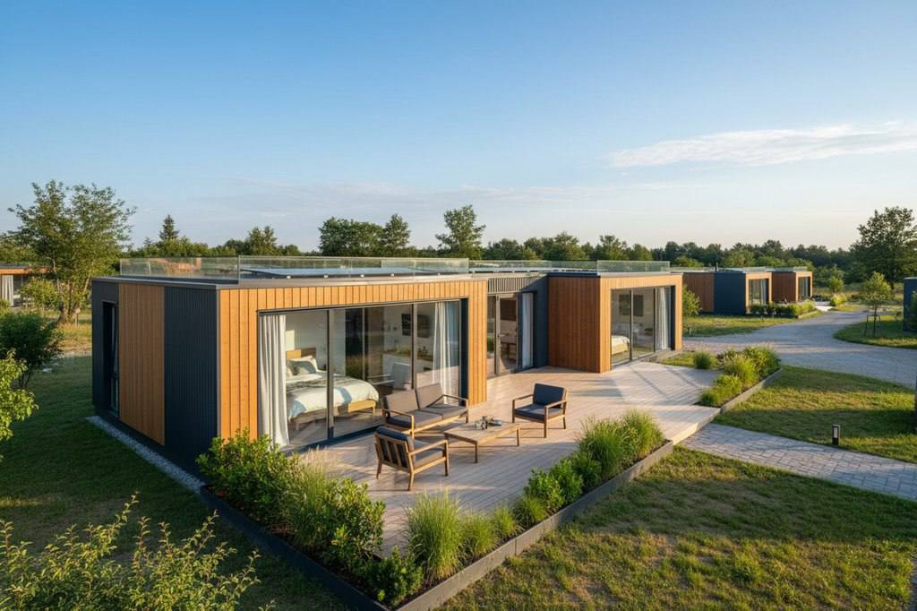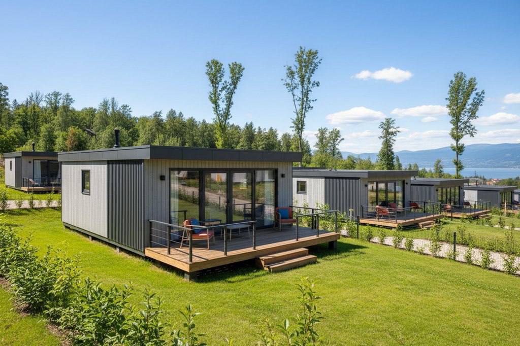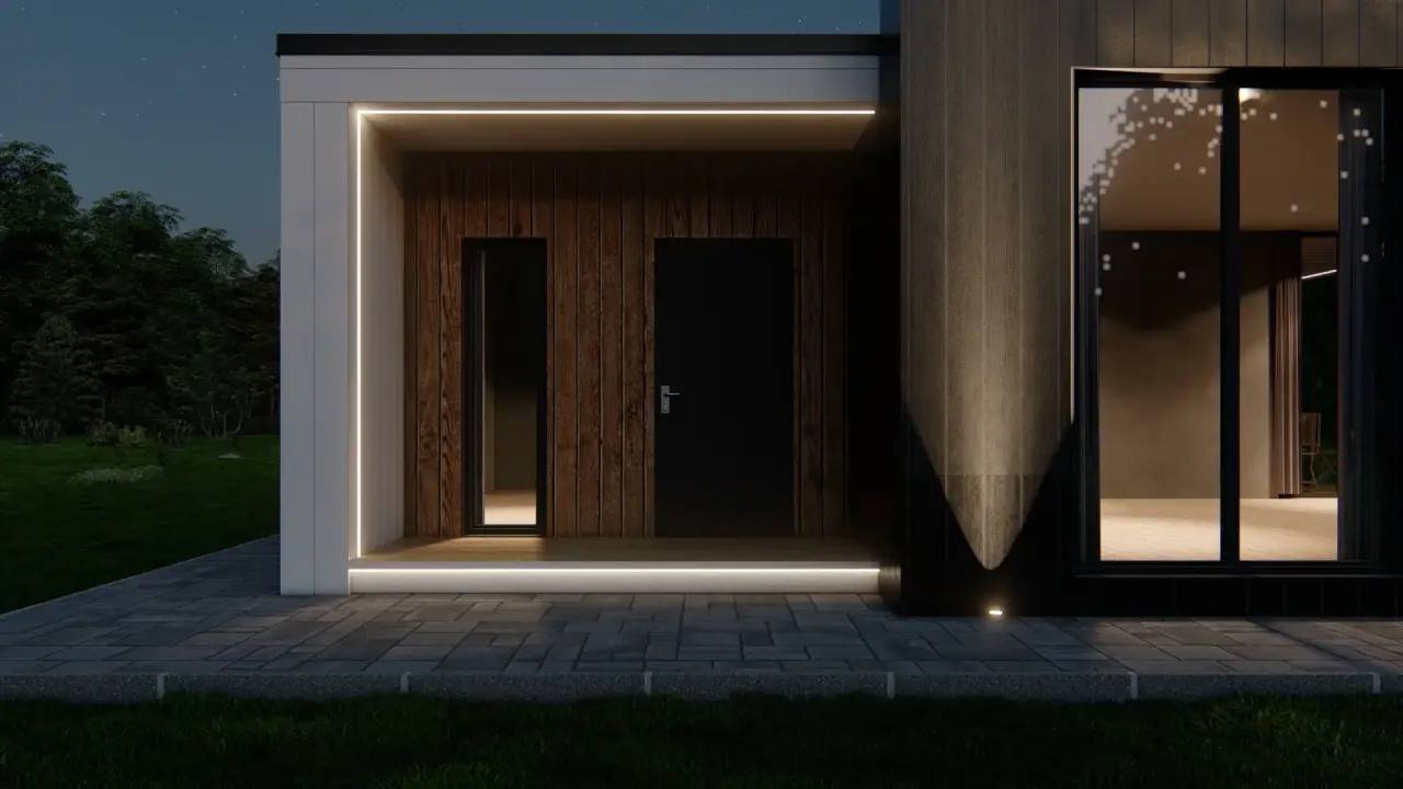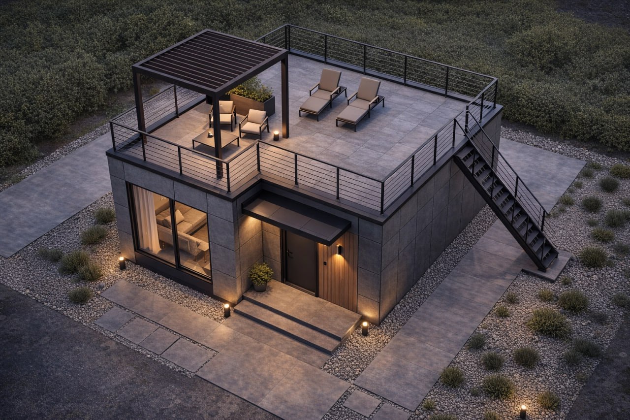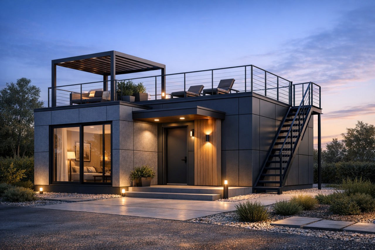 Модульный дом по этому проекту — современное, стильное и полнофункциональное решение для круглогодичного проживания за городом.