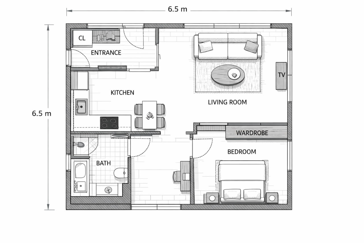 Продуманная планировка позволит с комфортом проживать в доме небольшой семье . Проект включает в себя просторную гостиную, две спальни, прихожую, санузел и террасу. Каждый квадратный метр используется с пользой.